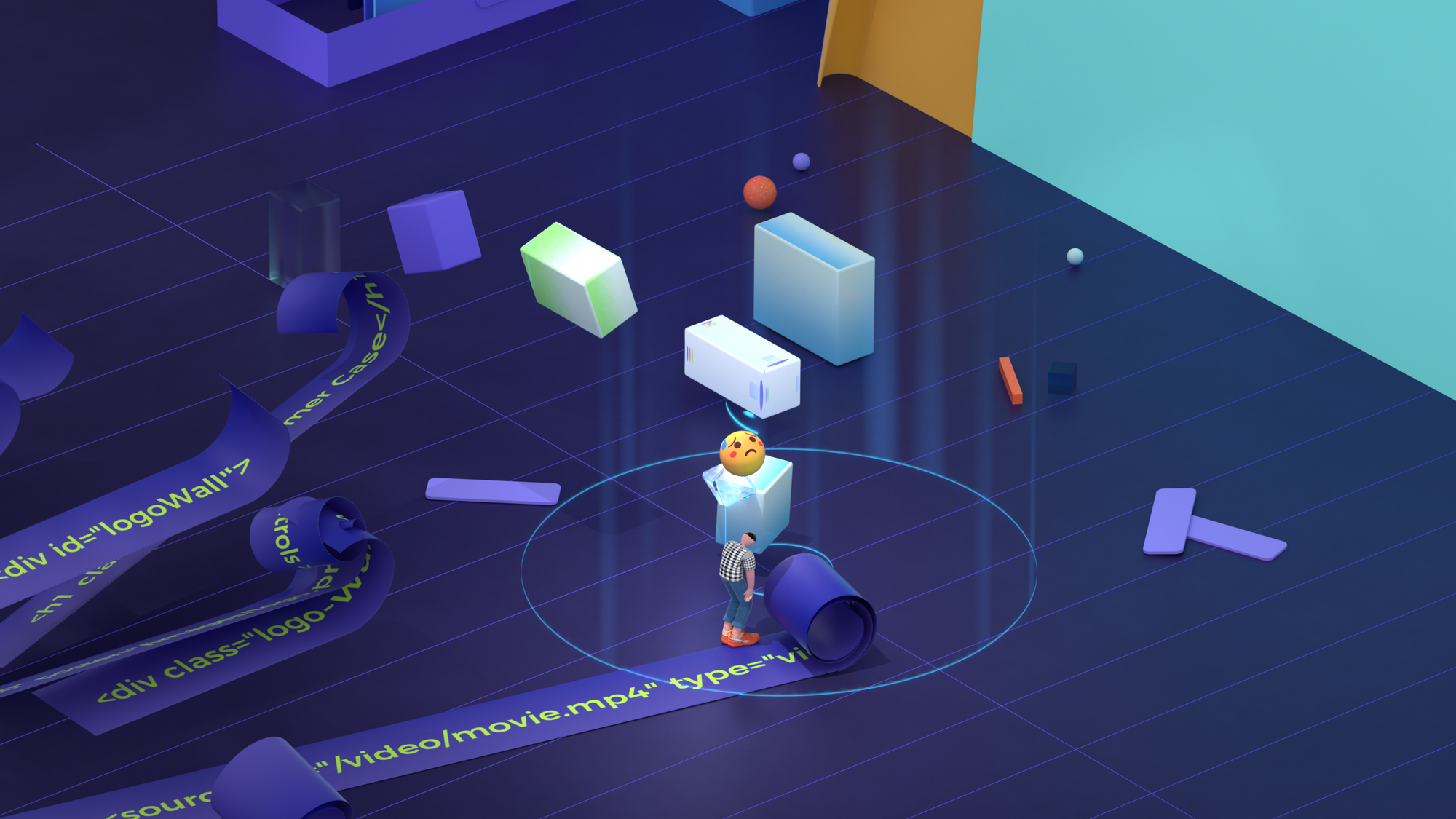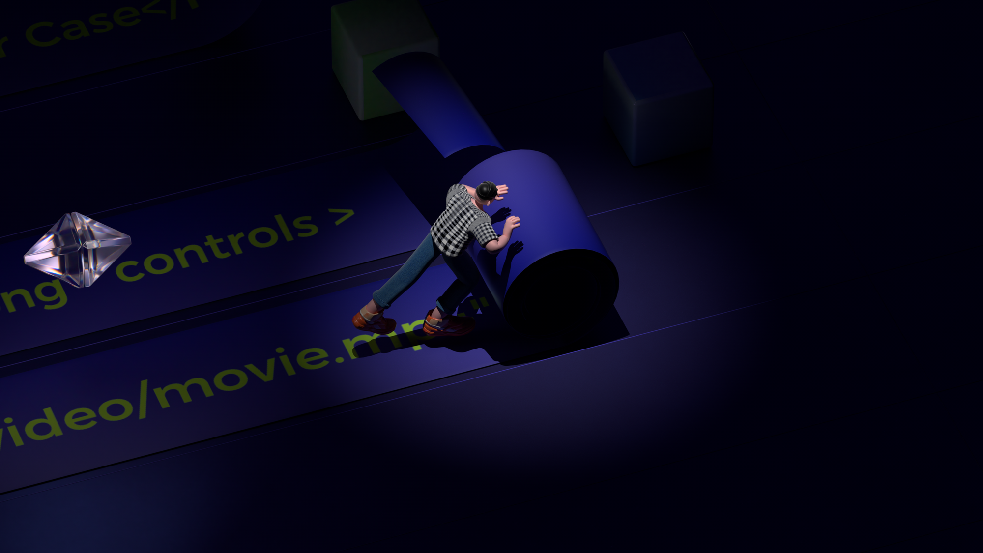 对个人带来的变化: 将一位在黑暗中孤立无援,苦苦堆砌代码的工程师作为表现对象,当棱锥click后,比喻轻流带来的新变化。工程师只需要拖拉拽组件就可以搭建好应用。