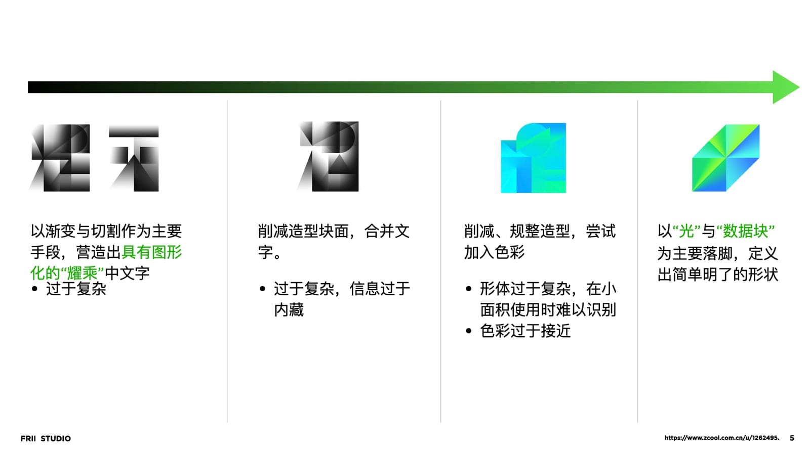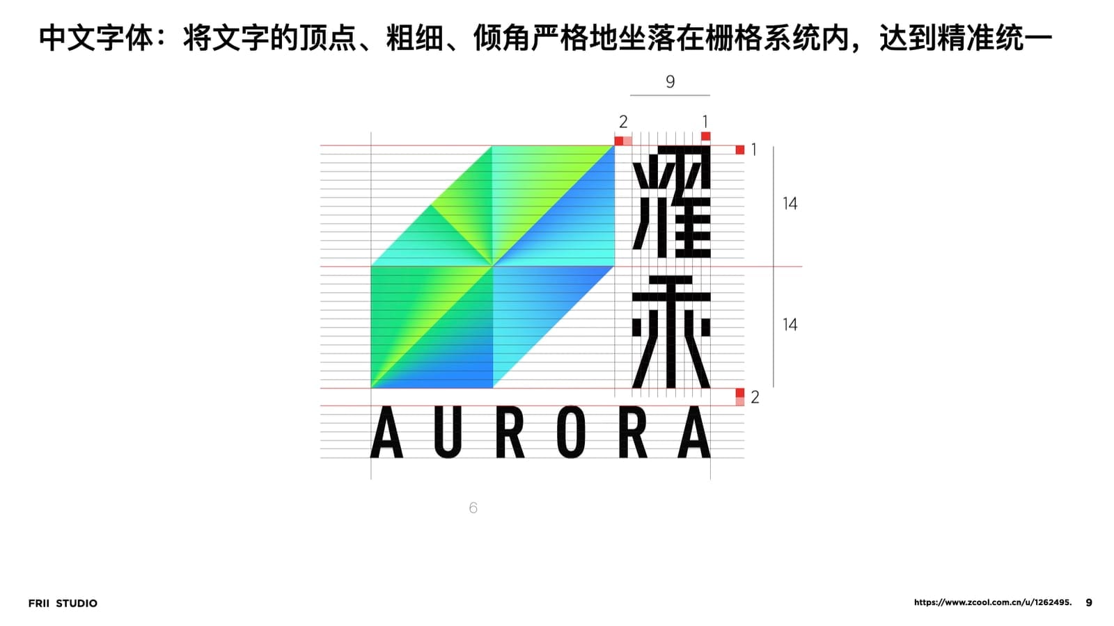 从AURORA极光的意向出发,我们对色彩与造型做了抽象。将客观表现提取成主观存在,这一步,每一位设计师都会有不一样的主观表达,这也是相同命题下,会产生不同方案的原因。而这都逃不开我们约定的“人格气质”。最后,我们归纳出视觉表达手法“渐变”与“切割”,将这两个手法进行logo造型建立。