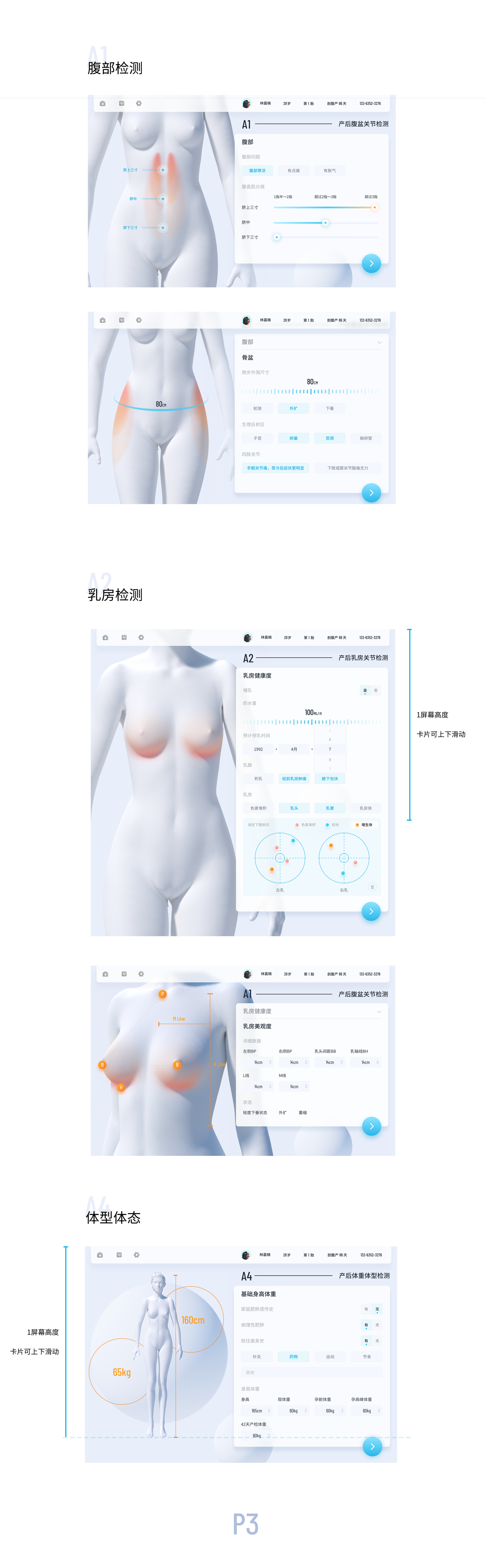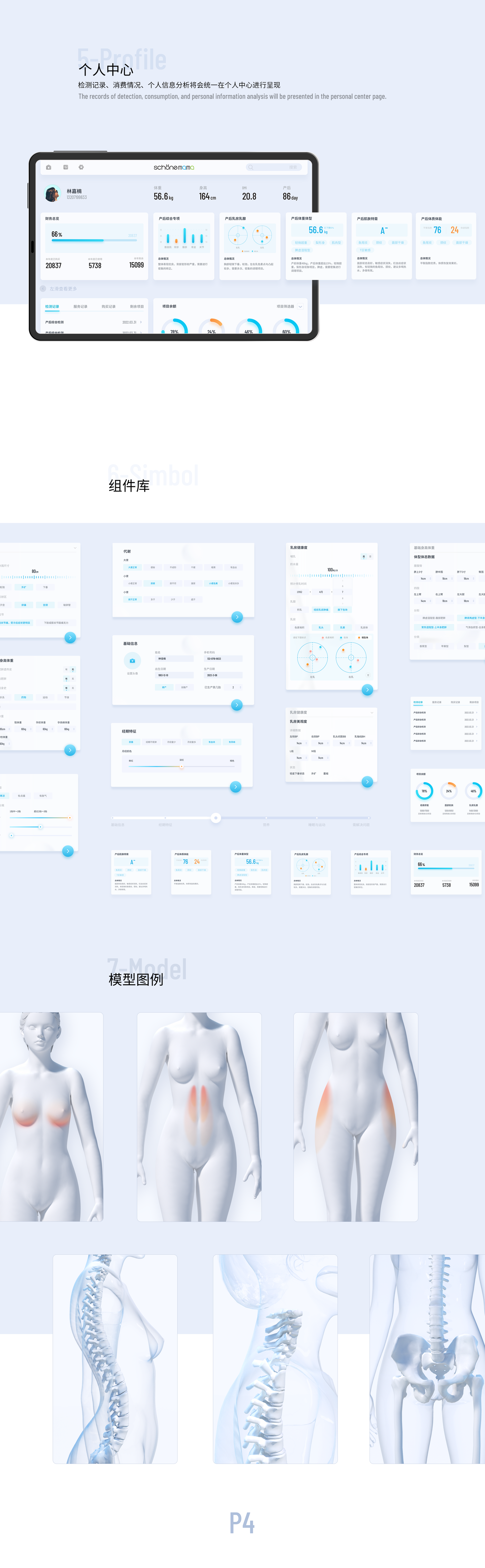 品牌资产:「A6检测标准」是美丽妈妈对产后人群进行长期的观察归纳,经过多年的梳理与优化,形成的一套产后健康评估的方法论与标准,也是本次数字化的设计的主体。它包含了身体各维度的健康指标定义。