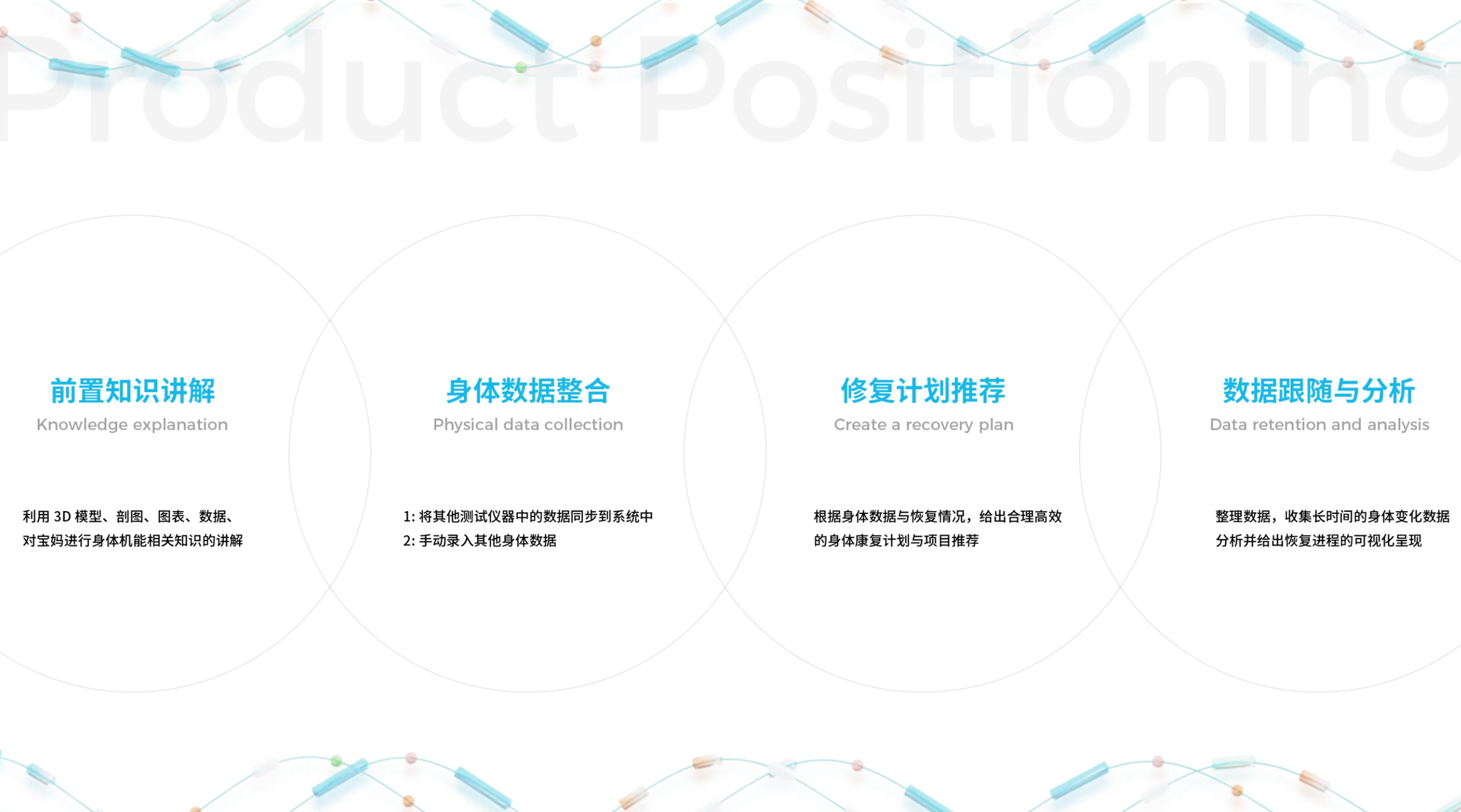 人群需要:主流的健康/医疗领域已经陆陆续续有很多数字化的APP介入,为其提供了很多便利。产后健康是泛健康领域中的分支,相对于主流的健康/医疗领域来说,他们得到的数字化技术的融入与助力相对较少。而现阶段的生育现状带来的「优生」观念,挖掘出更多中产母亲对自身产后健康的关注与护理需求。这些需求亟待被满足,而另一边又缺少数字化产品的助力,我们发现了这个矛盾,并以此为机会,进行了此次的设计。