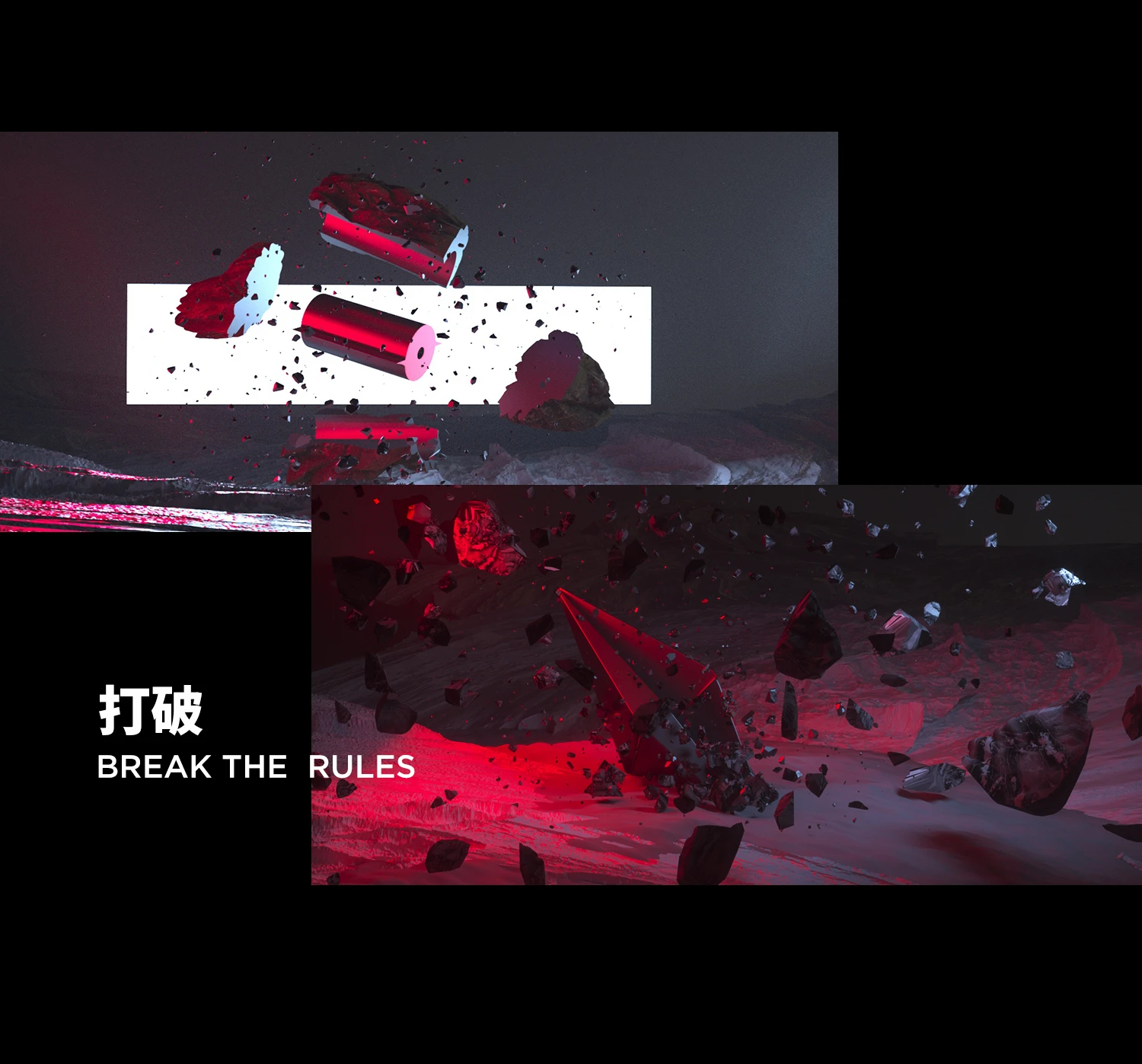在概念过程中,尝试不同的“打破”方式,为不同的“破”赋予现实场景的对应,同时考虑视觉冲击与避免信息传递歧义