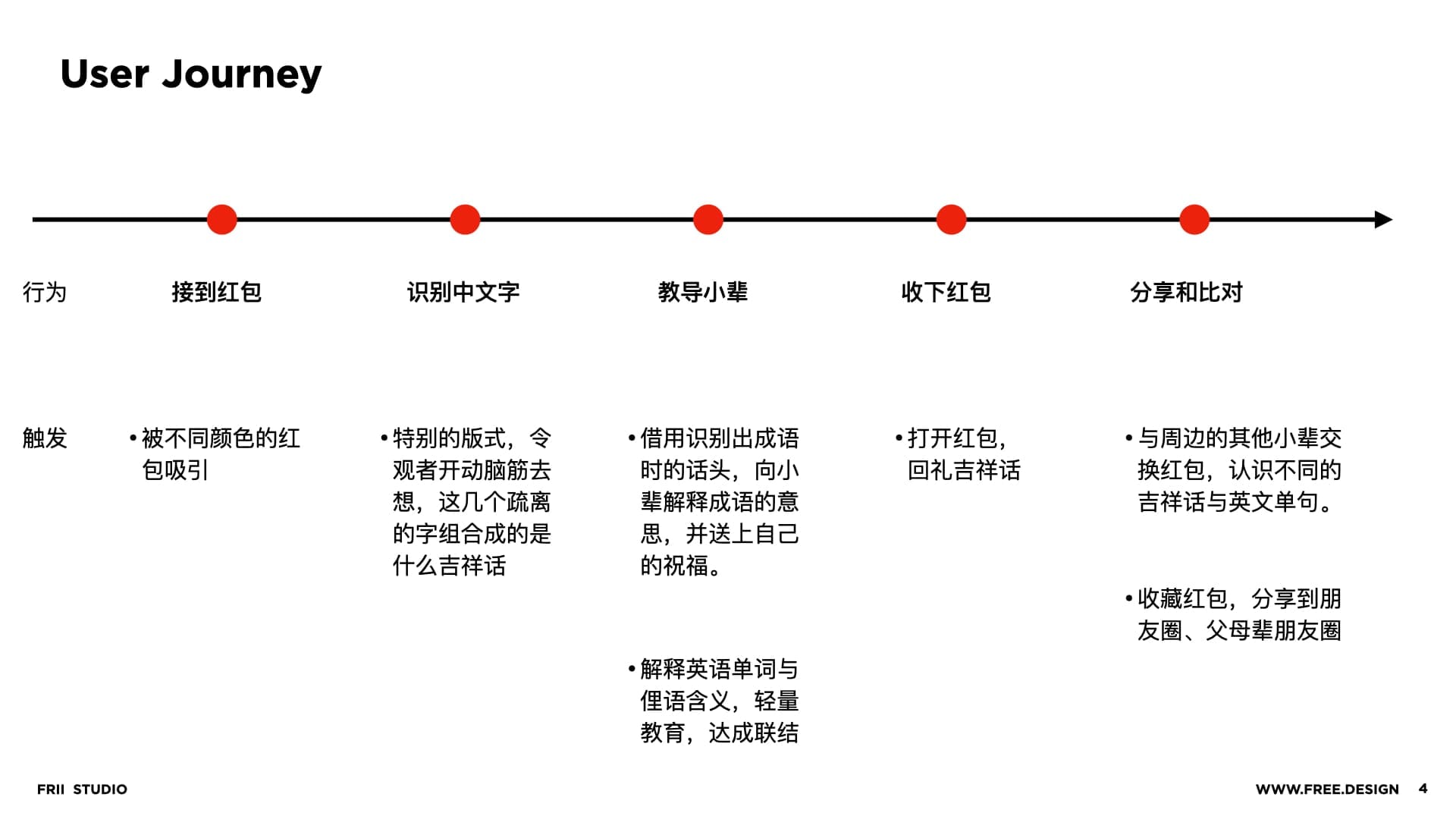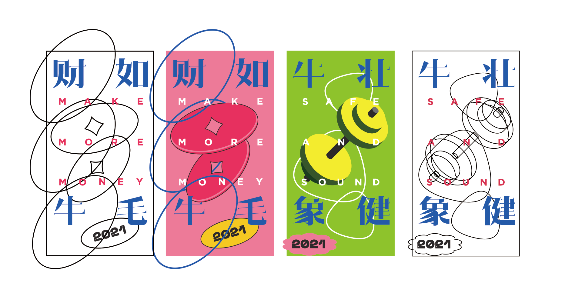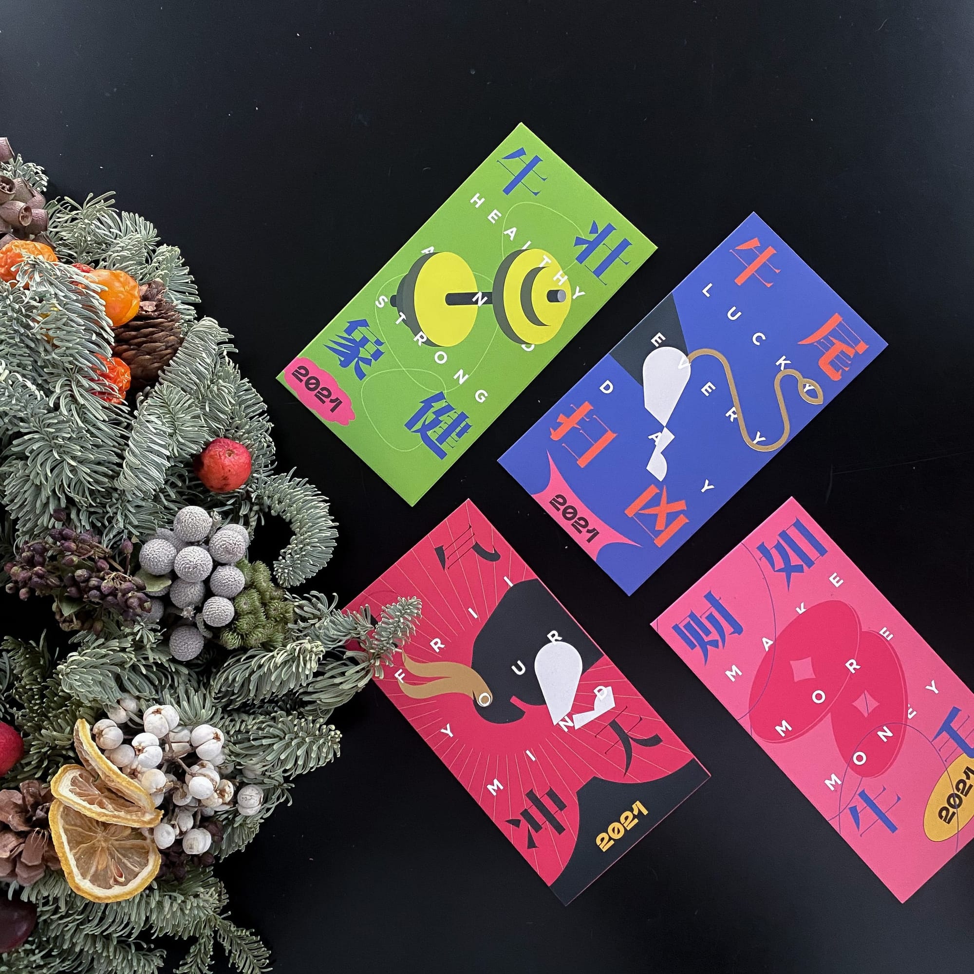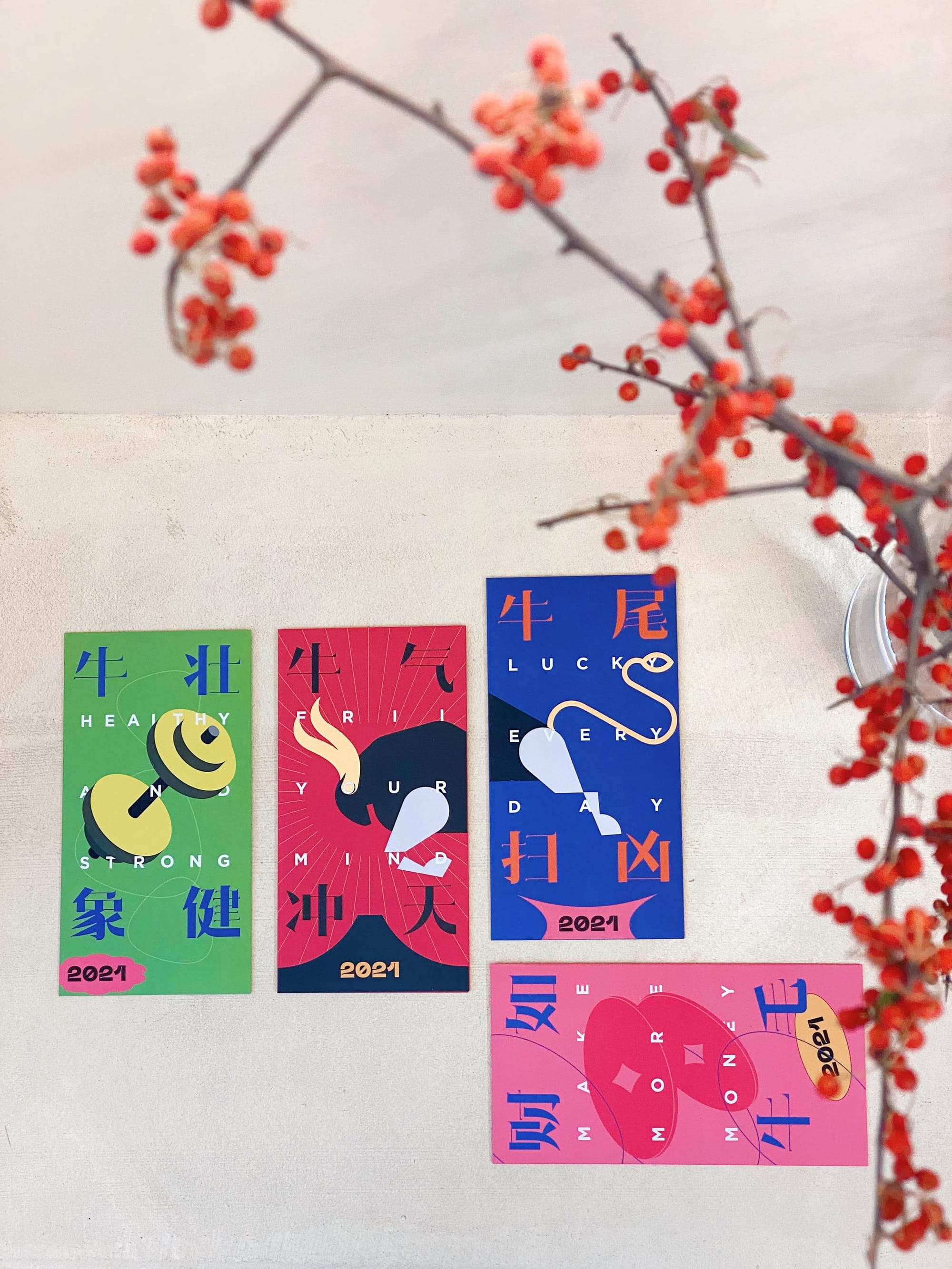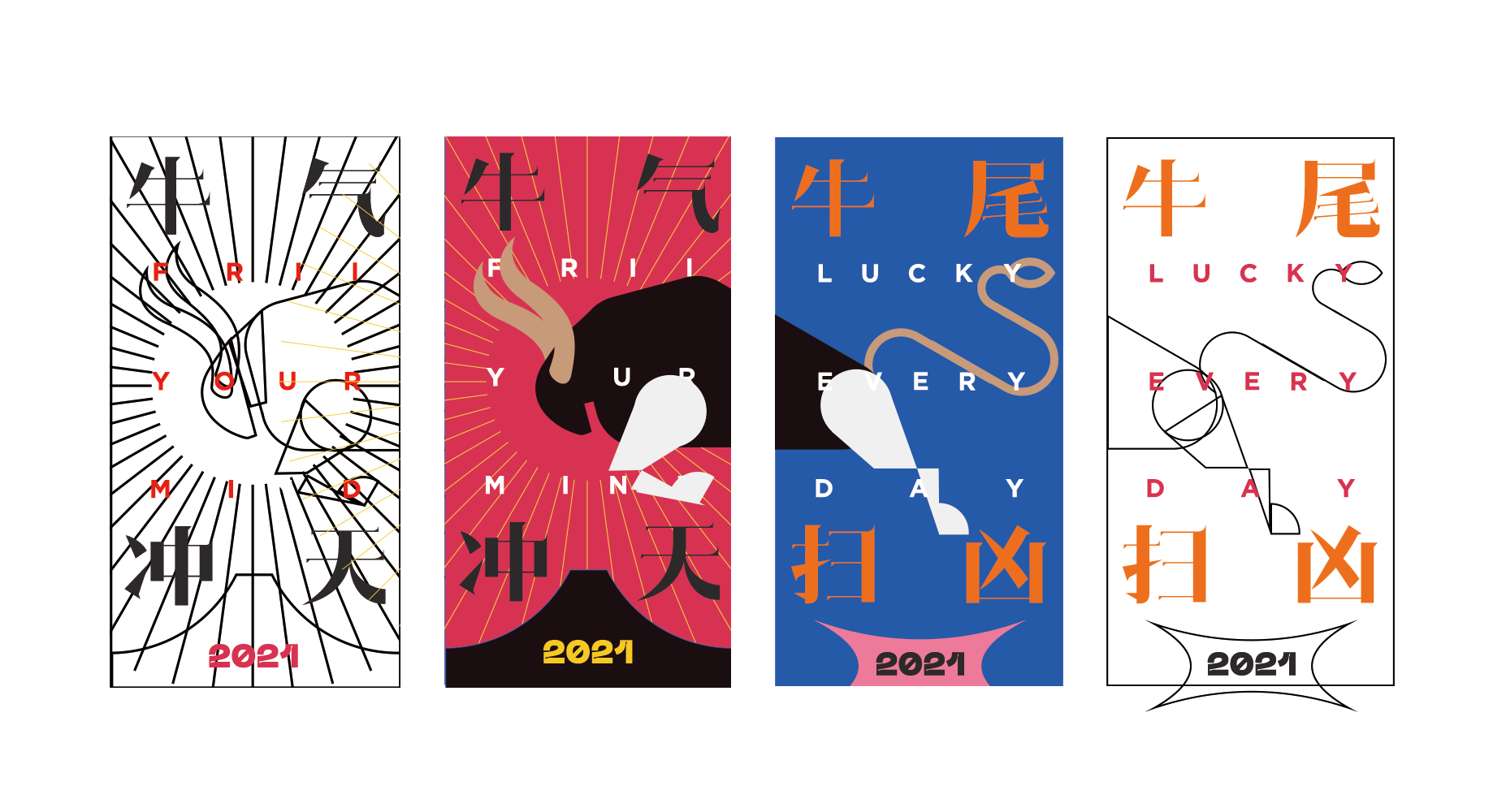 牛尾扫凶:很好理解,牛尾巴是个吉利的东西,可以帮你扫去坏运气,其实对应的就是天天好运。我的小侄子在学英语,但是词汇量也没有很多。我希望用简单的词汇与他的生活产生联系。我是说,产生我与他的联系。让他轻易认出,这些单词也会成为他接过红包之后的User Journey上的一个小触点,得到我的祝福的传递。