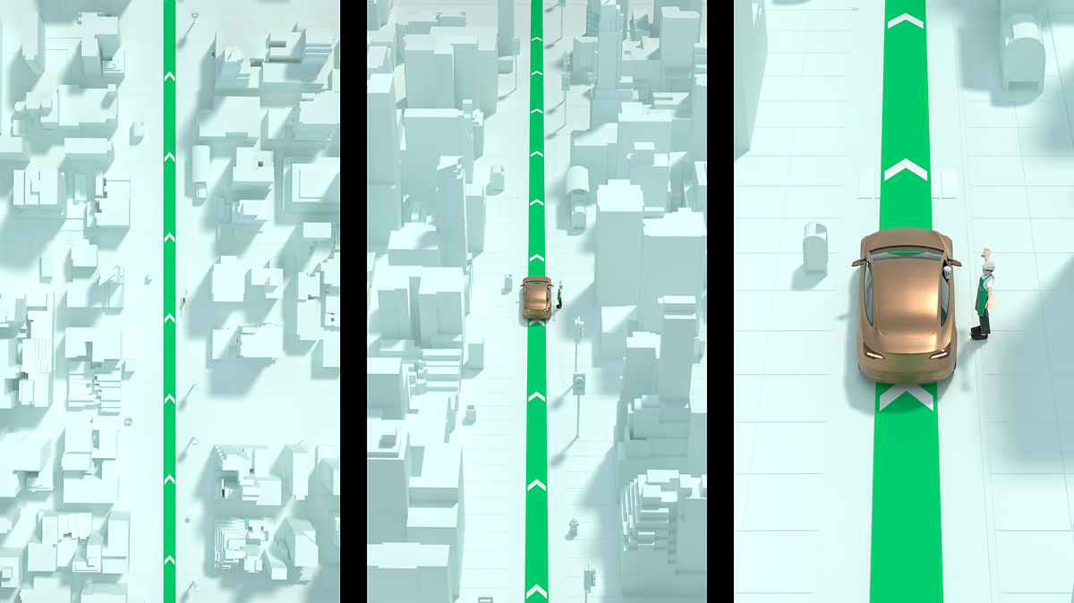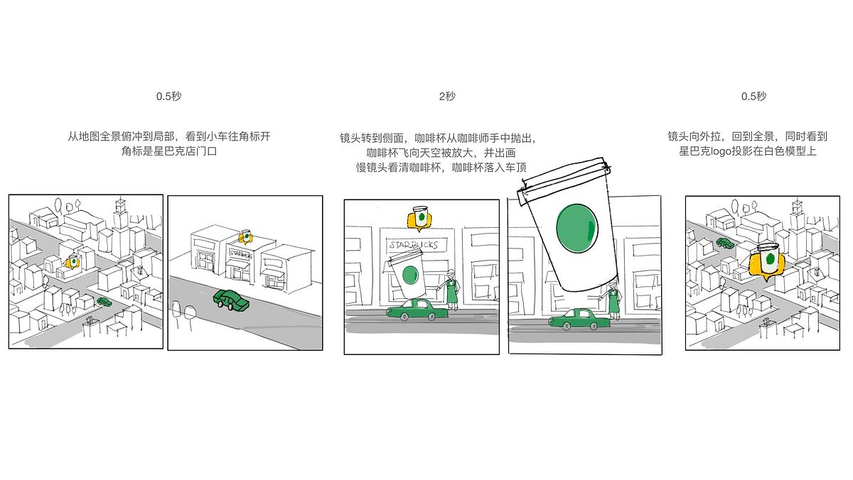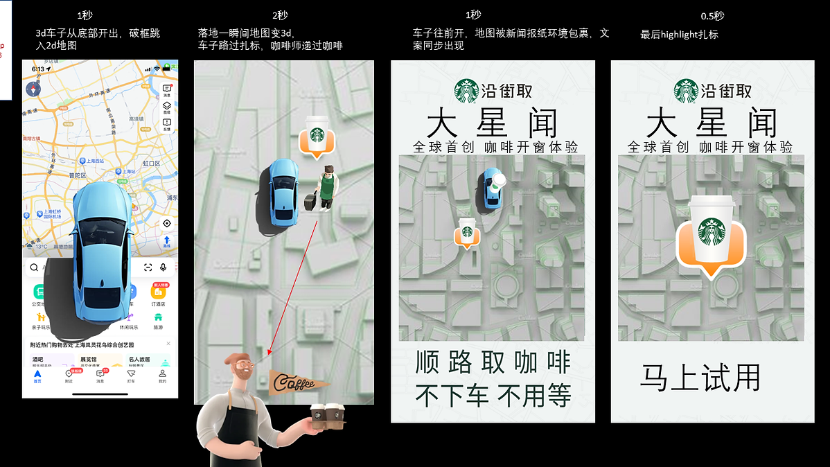2-3s:车子落地瞬间地图变成3d,车子路过轧标,咖啡师递过咖啡