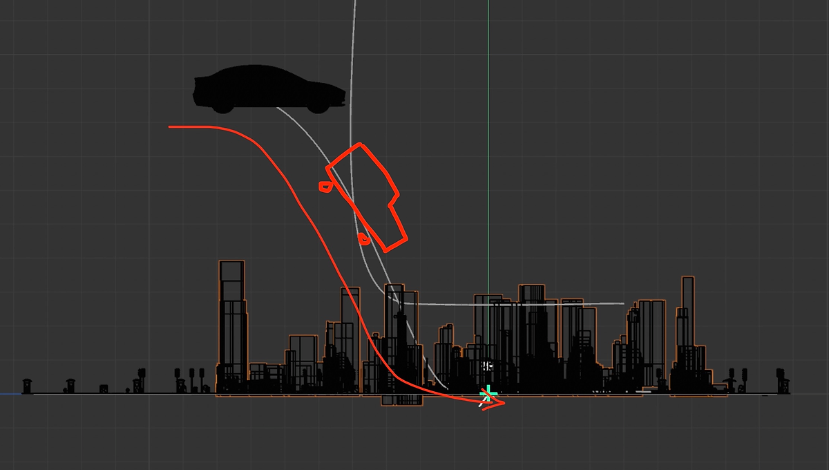 此时,FRII的面前出现了本次项目最大的难点,车子从地图开出俯冲的过程,裸眼3d的表现效果不尽人意。经过小伙伴们仔细的观察,认为问题出在飞出和降落到地面的感觉还不够强烈,所以我们尝试这调整车子的下落角度,调整运动中车头的角度,尽可能模拟现实中的飞车运动。