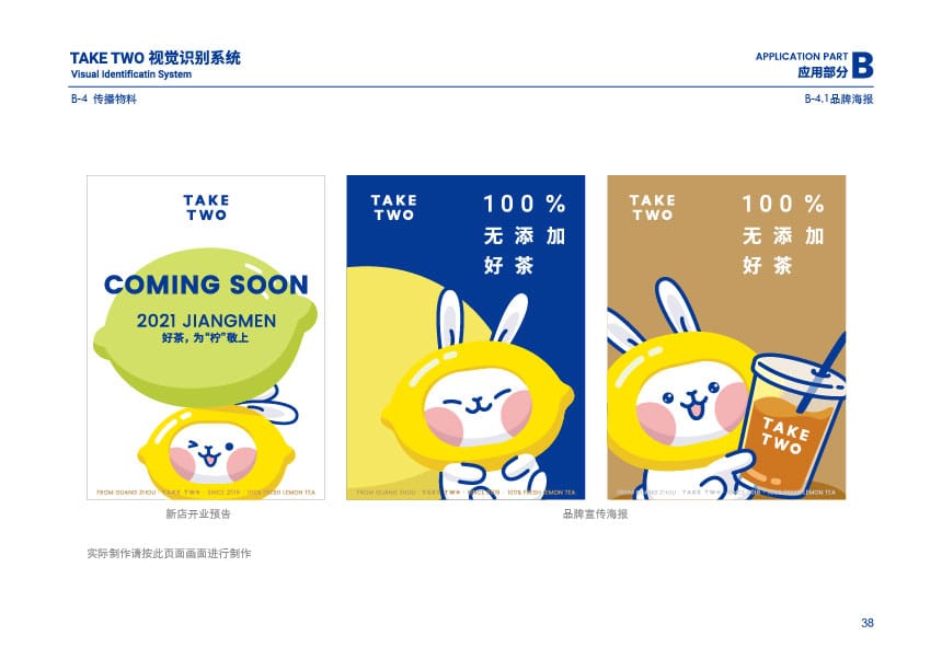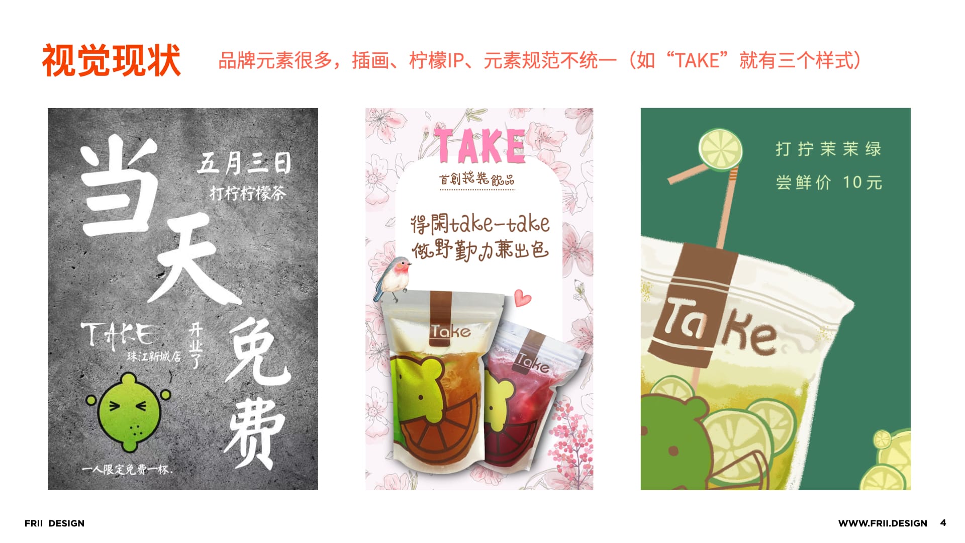 TAKE的视觉元素为毛笔、水墨、在落地实操上难以延展、统一。LOGO+插画系统+IP视觉风格难以调和,使得每类元素只能单独出现,难以形成视觉聚力,难以对用户产生视觉记忆点。