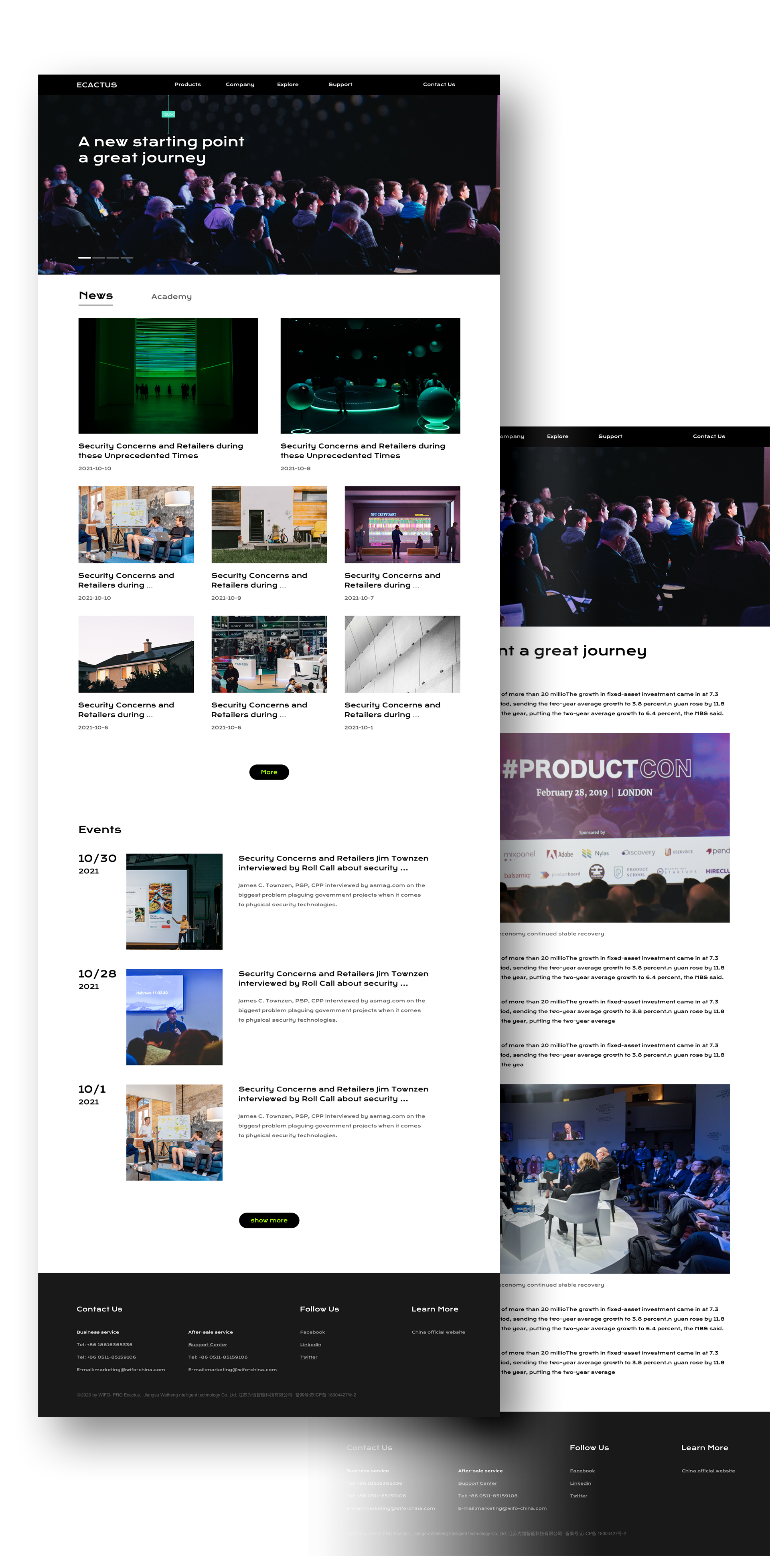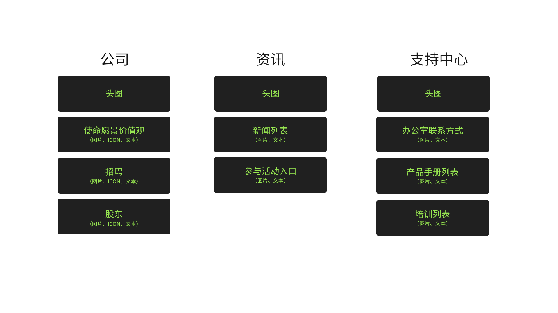 公司:公司文化呈现类;业务类:招聘、联系、支持中心、新闻。